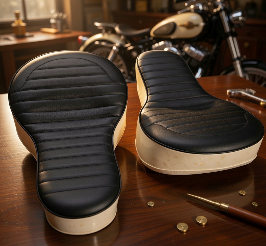 Sitzbänke für Motorräder erhalten neue Polsterung, Lederbezug und maßgenaue Anpassung.